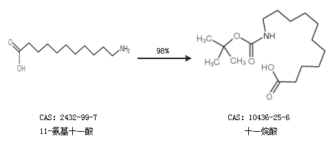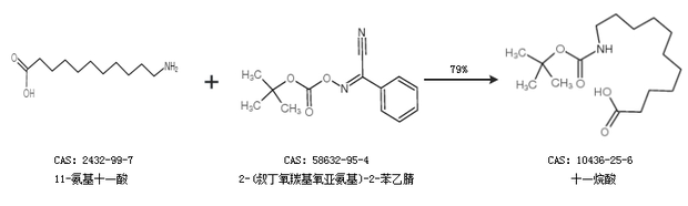 2.通过11-氨基十一酸和2-(叔丁氧羰基氧亚氨基)-2-苯乙腈合成十一烷酸,收率约79%;