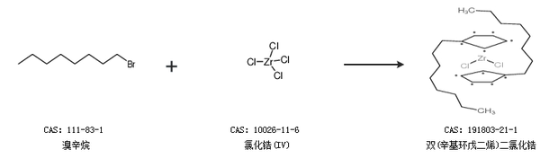 1.通过溴辛烷和氯化锆(IV)合成双(辛基环戊二烯)二氯化锆