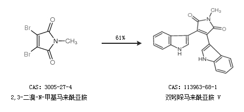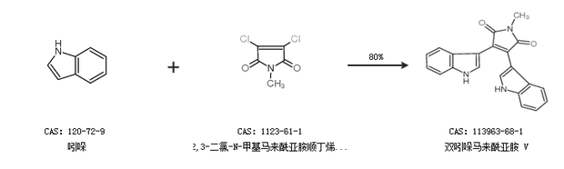 1.通过吲哚和2,3-二氯-N-甲基马来酰亚胺顺丁烯二酰亚胺合成双吲哚马来酰亚胺 V,收率约80%;
