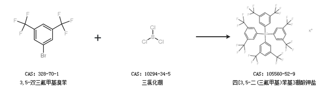 1.通过3,5-双三氟甲基溴苯和三氯化硼合成四[3,5-二(三氟甲基)苯基]硼酸钾盐