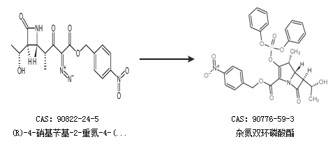 1.通过(R)-4-硝基苄基-2-重氮-4-((2R,3S)-3-((R)-1-羟乙基)-氮杂环丁-4-酮-2-基]-3-氧代戊酸酯合成杂氮双环磷酸酯