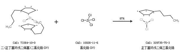 1.通过二(正丁基环戊二烯基)二氯化锆(IV)和氯化锆(IV)合成正丁基环戊二烯三氯化锆,收率约87%;