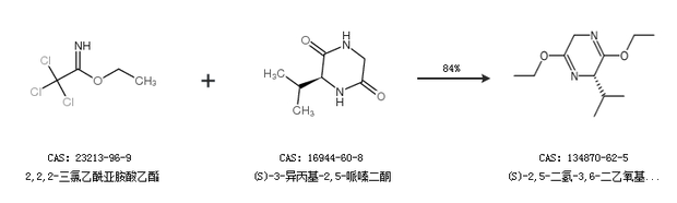 2.通过2,2,2-三氯乙酰亚胺酸乙酯和(S)-3-异丙基-2,5-哌嗪二酮合成(S)-2,5-二氢-3,6-二乙氧基-2-异丙基吡嗪,收率约84%;
