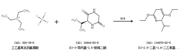 1.通过三乙基氧翁四氟硼酸和(S)-3-异丙基-2,5-哌嗪二酮合成(S)-2,5-二氢-3,6-二乙氧基-2-异丙基吡嗪,收率约91%;