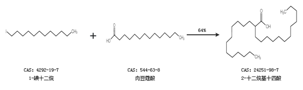1.通过1-碘十二烷和肉豆蔻酸合成2-十二烷基十四酸,收率约64%;