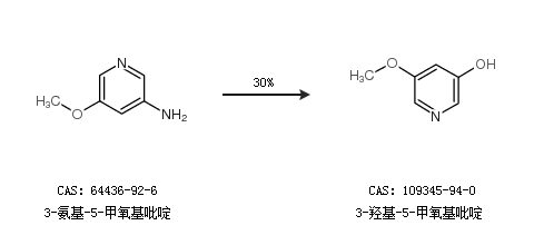 1.通过3-氨基-5-甲氧基吡啶合成3-羟基-5-甲氧基吡啶,收率约30%;