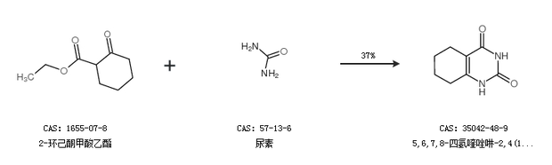 1.通过2-环己酮甲酸乙酯和尿素合成5,6,7,8-四氢喹唑啉-2,4(1H,3H)-二酮,收率约37%;