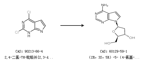 2.通过2,4-二氯-7H-吡咯并[2,3-d]嘧啶合成(2R,3S,5R)-5-(4-氨基-7H-吡咯[2,3-D]嘧啶-7-基-2 -(羟甲基)四氢呋喃-3-醇