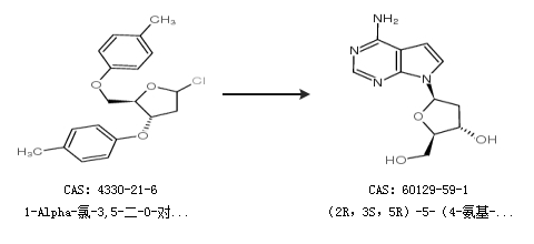1.通过1-Alpha-氯-3,5-二-O-对甲苯甲酰基-2-脱氧-D-呋喃核糖合成(2R,3S,5R)-5-(4-氨基-7H-吡咯[2,3-D]嘧啶-7-基-2 -(羟甲基)四氢呋喃-3-醇