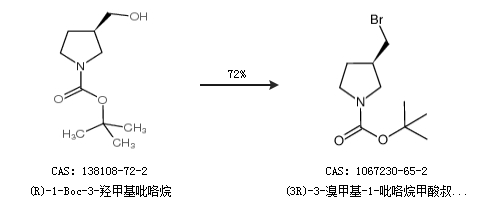 1.通过(R)-1-Boc-3-羟甲基吡咯烷合成(3R)-3-溴甲基-1-吡咯烷甲酸叔丁酯,收率约72%;