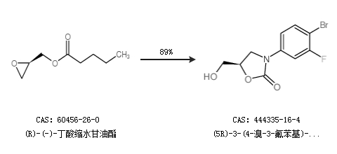1.通过(R)-(-)-丁酸缩水甘油酯合成(5R)-3-(4-溴-3-氟苯基)-5-羟甲基恶唑烷-2-酮,收率约89%;