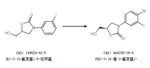 2.通过(R)-3-(3-氟苯基)-5-羟甲基恶唑烷-2-酮合成(5R)-3-(4-溴-3-氟苯基)-5-羟甲基恶唑烷-2-酮