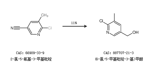 2.通过2-氯-5-氰基-3-甲基吡啶合成(6-氯-5-甲基吡啶-3-基)甲醇,收率约11%;