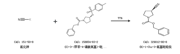 1.通过氰化钾和(S)-3-(甲苯-4-磺酰氧基)-吡咯烷-1-羧酸苄基酯合成(R)-1-Cbz-3-氰基吡咯烷,收率约77%;
