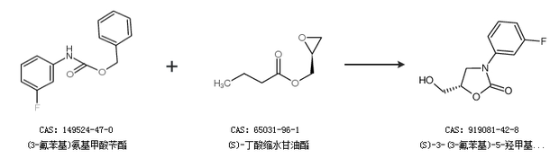1.通过(3-氟苯基)氨基甲酸苄酯和(S)-丁酸缩水甘油酯合成(S)-3-(3-氟苯基)-5-羟甲基恶唑烷-2-酮