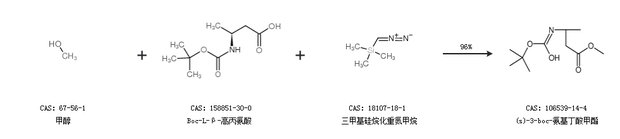 1.通过甲醇、Boc-L-β-高丙氨酸和三甲基硅烷化重氮甲烷合成(s)-3-boc-氨基丁酸甲酯,收率约96%;