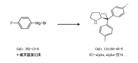 1.通过4-氟苯基溴化镁合成(S)-alpha,alpha-双(4-氟苯基)-2-吡咯烷甲醇,收率约90%;