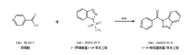 1.通过异烟酸和1-(甲磺酰基)-1H-苯并三唑合成1-(4-吡啶基羰基)苯并三唑,收率约84%;