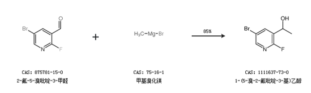 1.通过2-氟-5-溴吡啶-3-甲醛和甲基溴化镁合成1-(5-溴-2-氟吡啶-3-基)乙醇,收率约85%;