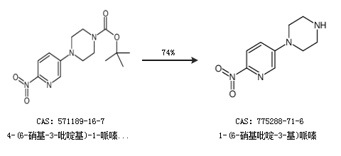 1.通过4-(6-硝基-3-吡啶基)-1-哌嗪甲酸叔丁酯合成1-(6-硝基吡啶-3-基)哌嗪,收率约74%;