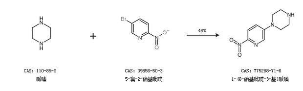2.通过哌嗪和5-溴-2-硝基吡啶合成1-(6-硝基吡啶-3-基)哌嗪,收率约46%;
