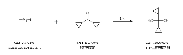 1.通过magnesium,carbanide,iodide和双环丙基酮合成1,1-二环丙基乙醇,收率约81%;
