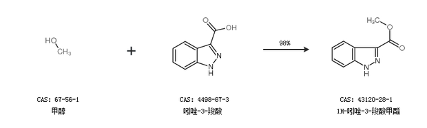 1.通过甲醇和吲唑-3-羧酸合成1H-吲唑-3-羧酸甲酯,收率约98%;