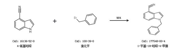 1.通过4-氰基吲哚和溴化苄合成1-苄基-1H-吲哚-4-甲腈,收率约96%;