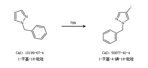 2.通过1-苄基-1H-吡唑合成1-苄基-4-碘-1H-吡唑,收率约79%;