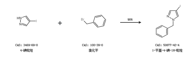 1.通过4-碘吡唑和溴化苄合成1-苄基-4-碘-1H-吡唑,收率约98%;