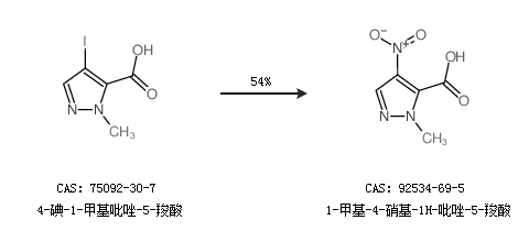 2.通过4-碘-1-甲基吡唑-5-羧酸合成1-甲基-4-硝基-1H-吡唑-5-羧酸,收率约54%;