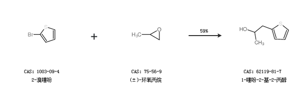 1.通过2-溴噻吩和(±)-环氧丙烷合成1-噻吩-2-基-2-丙醇,收率约59%;
