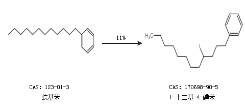 2.通过烷基苯合成1-十二基-4-碘苯,收率约11%;