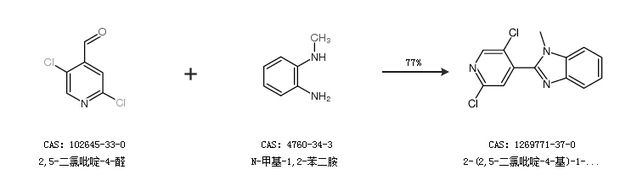 1.通过2,5-二氯吡啶-4-醛和N-甲基-1,2-苯二胺合成2-(2,5-二氯吡啶-4-基)-1-甲基-1H-苯并咪唑,收率约77%;