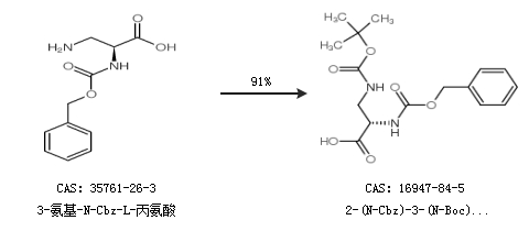 1.通过3-氨基-N-Cbz-L-丙氨酸合成2-(N-Cbz)-3-(N-Boc)-2,3-二氨基丙酸,收率约91%;