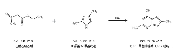 1.通过乙酰乙酸乙酯和3-氨基-5-甲基吡唑合成2,5-二甲基吡唑并[1,5-a]嘧啶-7-醇,收率约84%;