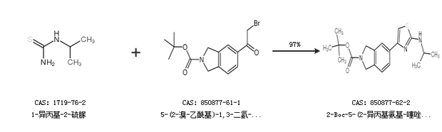 1.通过1-异丙基-2-硫脲和5-(2-溴-乙酰基)-1,3-二氢-异吲哚-2-羧酸叔丁酯合成2-Boc-5-(2-异丙基氨基-噻唑-4-基)-异吲哚啉,收率约97%;