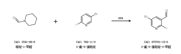 1.通过哌啶-1-甲醛和2-氟-5-溴吡啶合成2-氟-5-溴吡啶-3-甲醛,收率约68%;