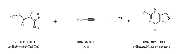 1.通过3-氨基-2-噻吩甲酸甲酯和乙腈合成2-甲基噻吩并[3,2-d]嘧啶-4(3H)-酮,收率约62%;