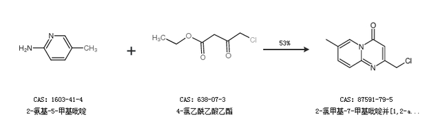 1.通过2-氨基-5-甲基吡啶和4-氯乙酰乙酸乙酯合成2-氯甲基-7-甲基吡啶并[1,2-a]嘧啶-4-酮,收率约53%;