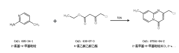 1.通过2-氨基-4-甲基吡啶和4-氯乙酰乙酸乙酯合成2-氯甲基-8-甲基吡啶并[1,2-a]嘧啶-4-酮,收率约72%;