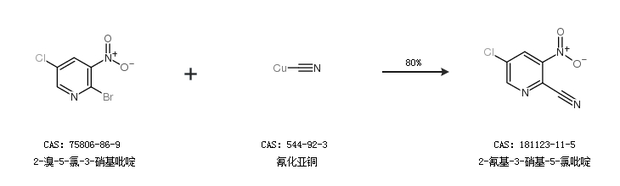 1.通过2-溴-5-氯-3-硝基吡啶和氰化亚铜合成2-氰基-3-硝基-5-氯吡啶,收率约80%;