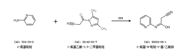 2.通过2-氨基吡啶和1-氰基乙酰-3,5-二甲基吡唑合成2-氰基-N-吡啶-2-基-乙酰胺,收率约88%;