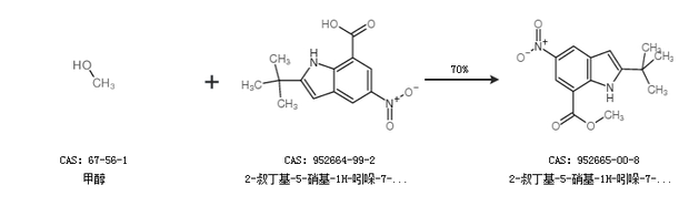 2.通过甲醇和2-叔丁基-5-硝基-1H-吲哚-7-羧酸合成2-叔丁基-5-硝基-1H-吲哚-7-羧酸甲酯,收率约70%;