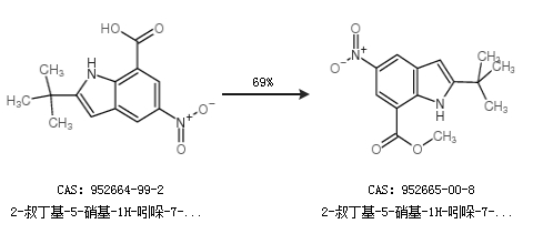 1.通过2-叔丁基-5-硝基-1H-吲哚-7-羧酸合成2-叔丁基-5-硝基-1H-吲哚-7-羧酸甲酯,收率约69%;