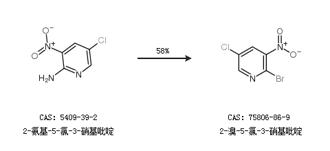 1.通过2-氨基-5-氯-3-硝基吡啶合成2-溴-5-氯-3-硝基吡啶,收率约58%;