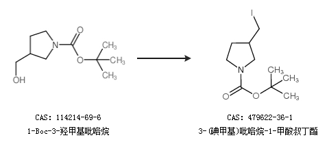 1.通过1-Boc-3-羟甲基吡咯烷合成3-(碘甲基)吡咯烷-1-甲酸叔丁酯