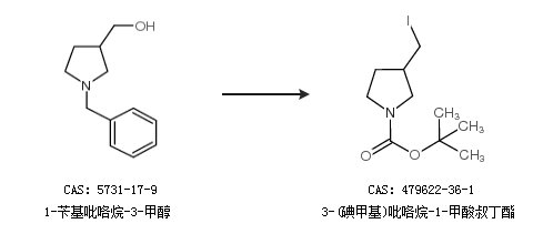2.通过1-苄基吡咯烷-3-甲醇合成3-(碘甲基)吡咯烷-1-甲酸叔丁酯