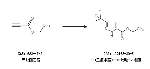 2.通过丙炔酸乙酯合成3-(三氟甲基)-1H-吡唑-5-羧酸乙酯