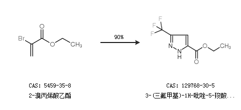 1.通过2-溴丙烯酸乙酯合成3-(三氟甲基)-1H-吡唑-5-羧酸乙酯,收率约90%;